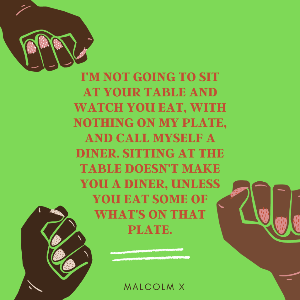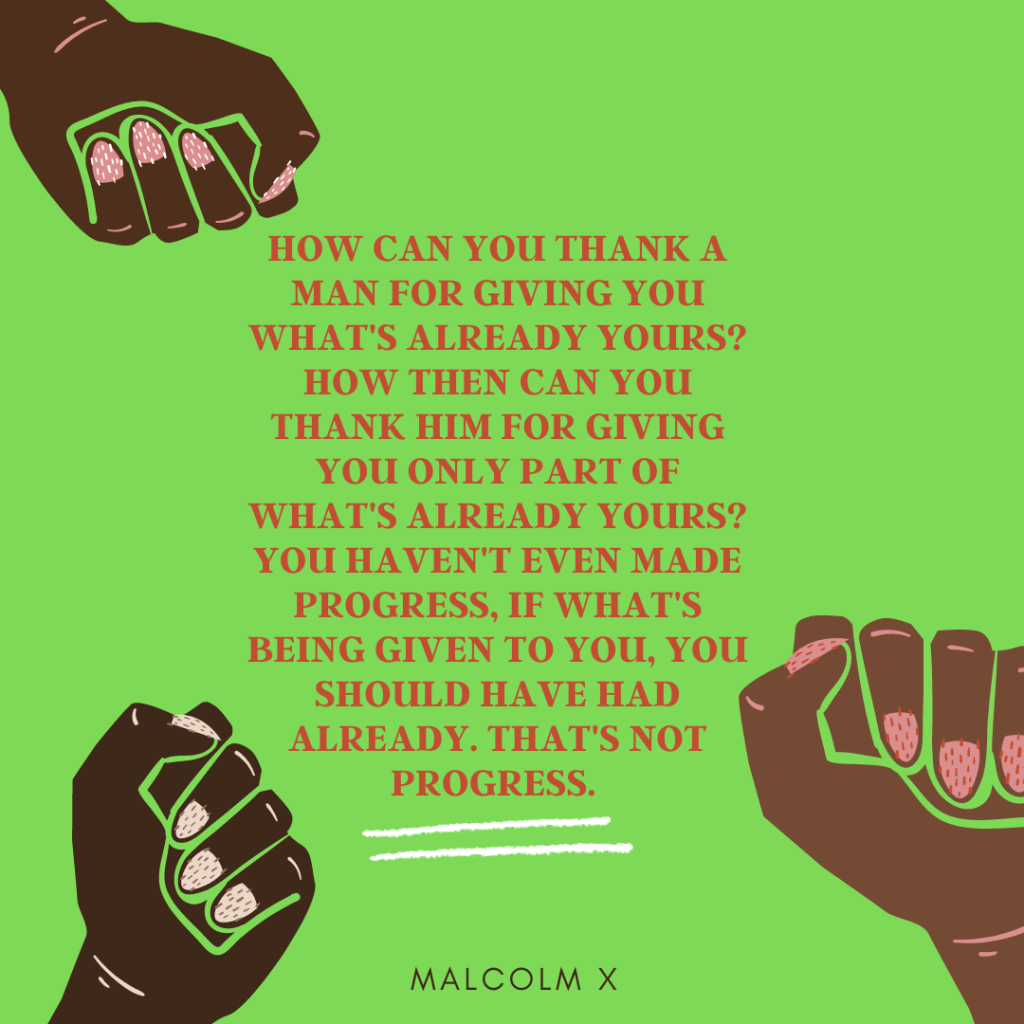 We love Malcolm for his passion, his persistence, for the ways in which he contained the collective rage of Black people, but also for the ways he held our hopes and dreams of freedom. We love him for his, at the time unconventional thinking, his willingness to step outside of the norm and see beyond the confines of Black inferiority that limited Black people.